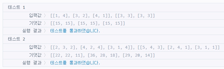 - 행렬 arr1, arr2의 원소는 -10 이상 20 이하인 자연수입니다.