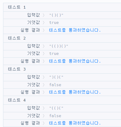 - 모든 반복이 끝난후 bucket이 0보다 크다면 열린괄호가 닫힌 괄호보다 많으므로 answer을 false로 설정