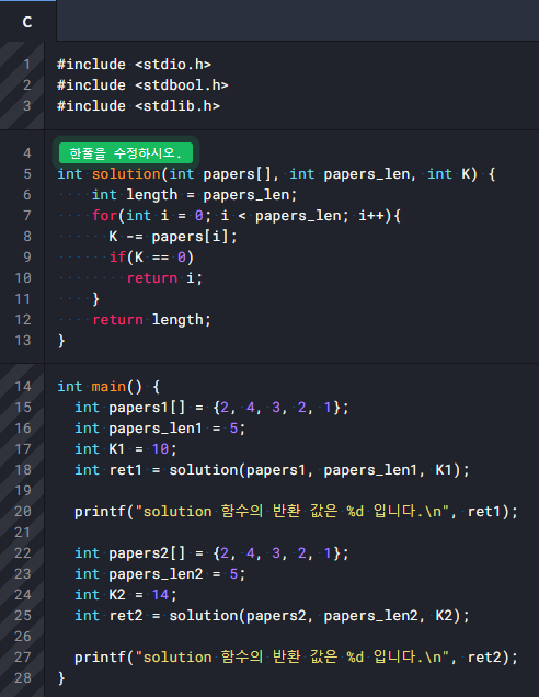 한 줄로 서 있는 사람들이 각자 필요로 하는 종이 수가 순서대로 들어있는 배열 papers, papers의 길이 papers_len 처음에 맨 앞사람에게 전달한 종이 수 K가 매개변수로 주어질때, 필요한 만큼의 종이를 받은 사람은 모두 몇 명인지 return하도록 solution함수를 작성했습니다. 그러나 코드 일부분이 잘못되어있기 때문에 몇몇 입력에 대해서는 올바르게 동작하지 않습니다. 주어진 코드에서 한 줄만 변경해서 모든 입력에 대해 올바르게 동작하도록 수정하세요.